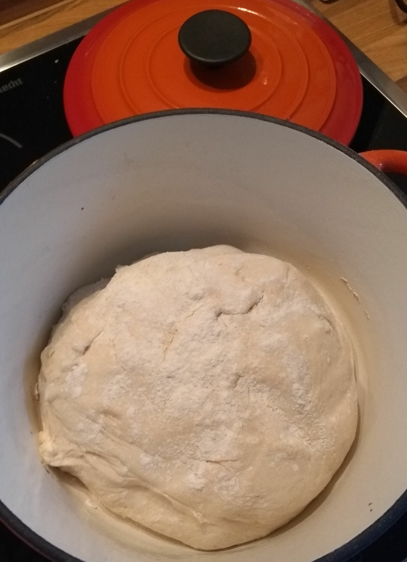 Anschließend den heißen Bräter aus dem Ofen holen. Den Boden des Bräters leicht mit Mehl bestreuen. Dann den Teigklumpen in den Bräter kippen und anschließend leicht mit Mehl bestreuen. Wer möchte kann mit einem scharfen Messer ein Muster in das Brot ritzen. Das Bild ist am Ende auf der Kruste sichtbar.